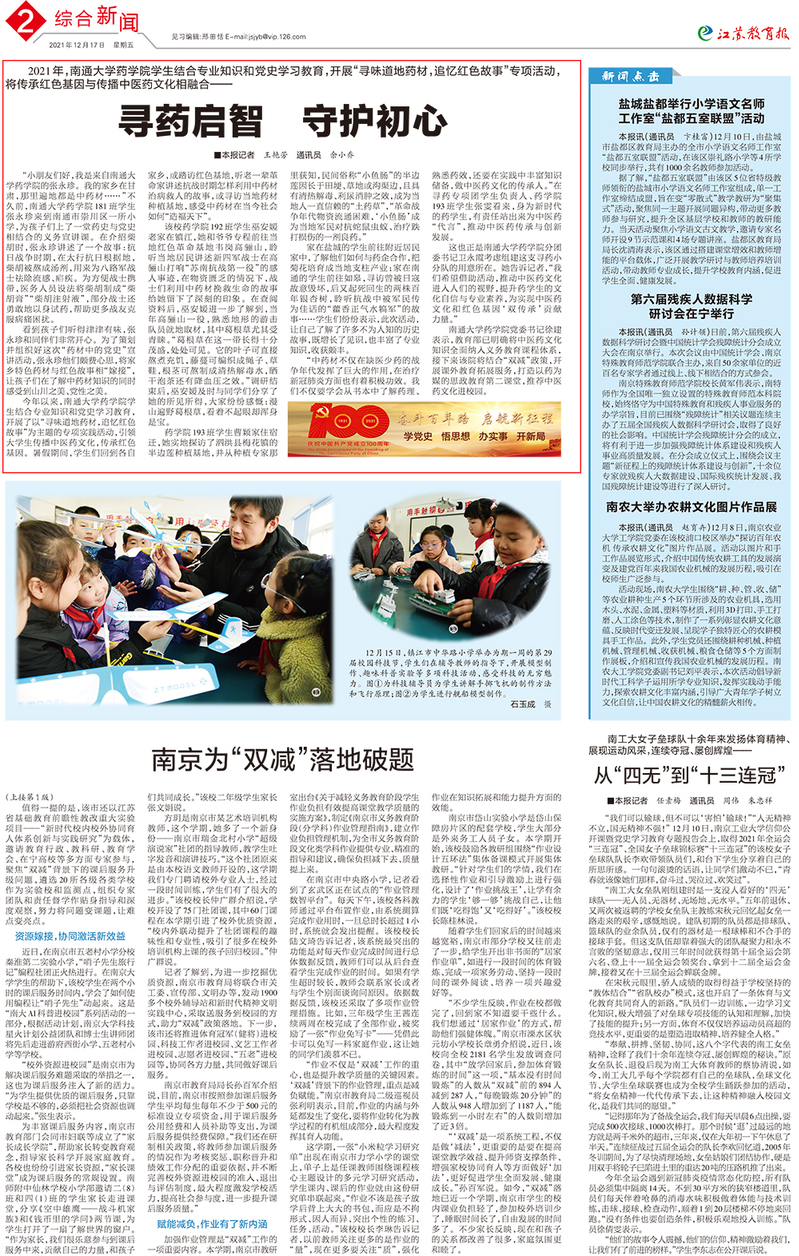 12月17日出版的《江苏教育报》以《寻药启智 守护初心》为题,关注我校药学院学生开展“寻味道地药材,追忆红色故事”专项实践活动。