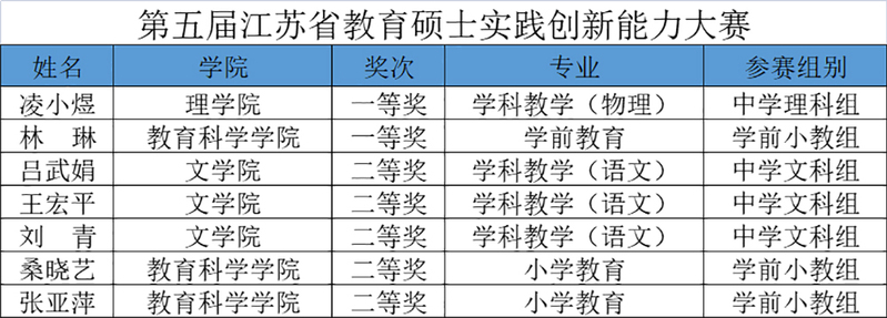 12月19日-21日,江苏省第五届教育硕士实践创新能力大赛在江苏大学举行。我校研究生获得一等奖2项,二等奖5项,学校荣获优秀组织奖。