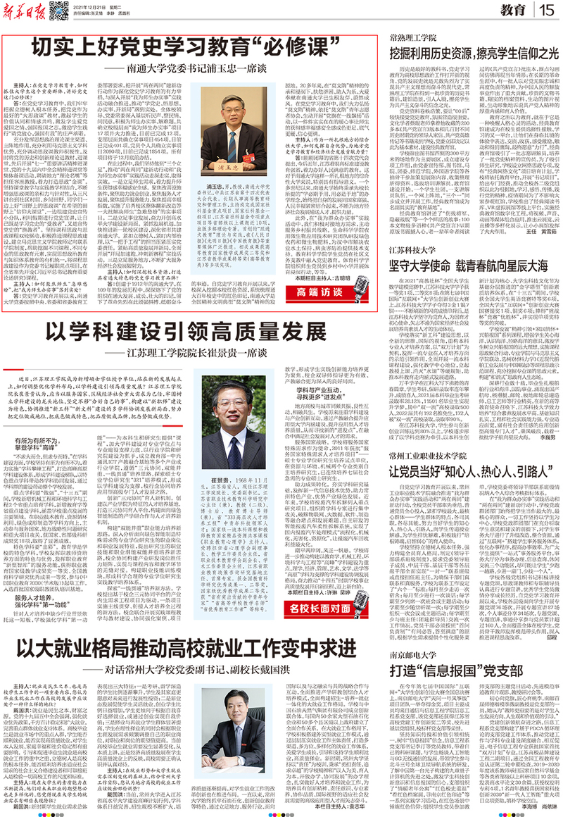12月21日出版的《新华日报》以《切实上好党史学习教育“必修课”》为题,就我校开展党史学习教育专访我校党委书记浦玉忠。