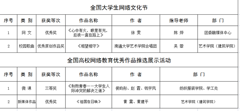 近日,教育部思想政治工作司公示第五届“全国大学生网络文化节”和“全国高校网络教育优秀作品推选展示活动”遴选结果,我校师生作品获得三等奖1项,优秀原创作品奖1项,优秀奖2项。