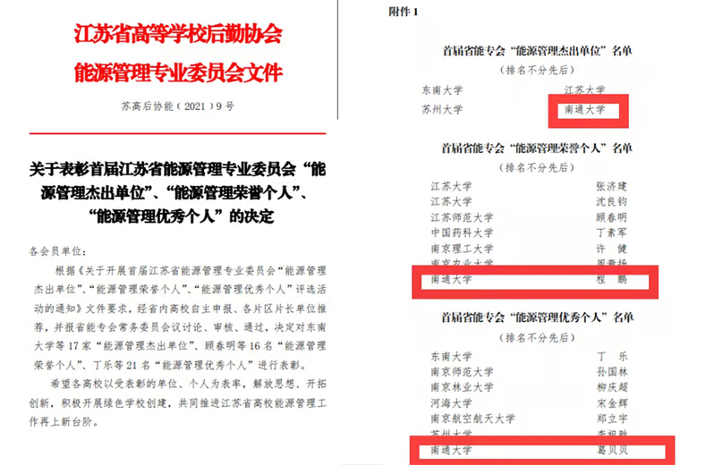 12月22日,江苏省高等学校后勤协会能源管理专业委员会发布《关于表彰首届江苏省能源管理专业委员会‘能源管理杰出单位’‘能源管理荣誉个人’‘能源管理优秀个人’的决定》。我校获评“能源管理杰出单位”。后勤保障部副部长程鹏获评“能源管理荣誉个人”,后勤保障部能源服务中心副主任葛贝贝获评“能源管理优秀个人”。