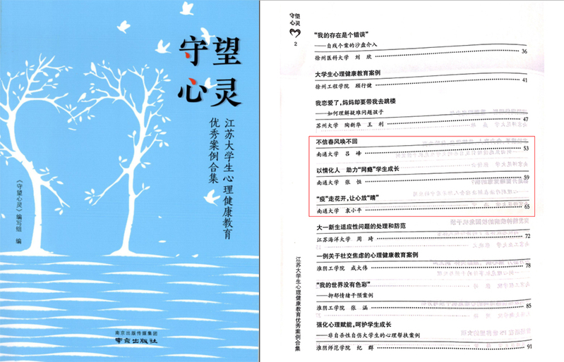近日,由江苏省教育厅高校学生处与江苏教育报刊总社联合编印的《大学生心理健康教育优秀案例集》出版发行。我校吕峰老师的《不信春风唤不回》、袁小平老师的《“疫”走花开,让心放“晴”》、张恒老师的《以情化人 助力“网瘾”学生成长》入选其中。