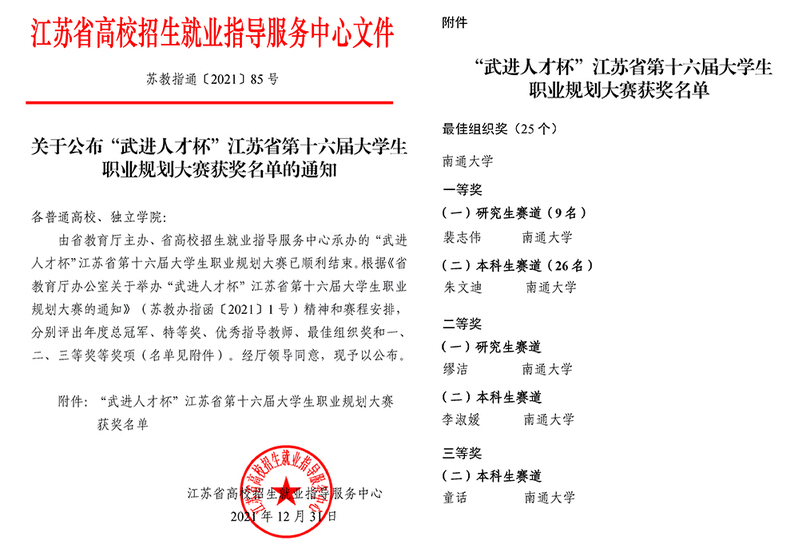 近日,江苏省第十六届大学生职业规划大赛总决赛落下帷幕。我校地理科学学院裴志伟(指导老师:李宇辉)荣获研究生组一等奖,公共卫生学院朱文迪(指导老师:陈碧君)荣获本科生组一等奖。教育科学学院缪洁(指导老师:赵敬龙)获研究生组二等奖,文学院李淑媛(指导老师:刘玲)获本科生组二等奖,地理科学学院童话(指导老师:李宇辉)获本科生组三等奖。我校荣获最佳组织奖。