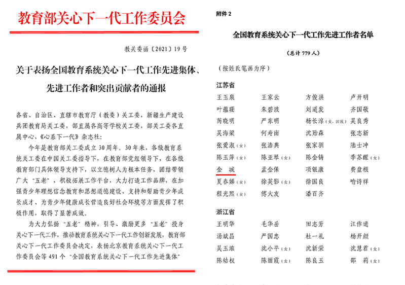 近日,教育部关心下一代工作委员会发文(教关委函〔2021〕19号)表扬全国教育系统关心下一代工作先进集体、先进工作者和突出贡献者,我校关工委常务副主任金城获“全国教育系统关心下一代工作先进工作者”荣誉称号。