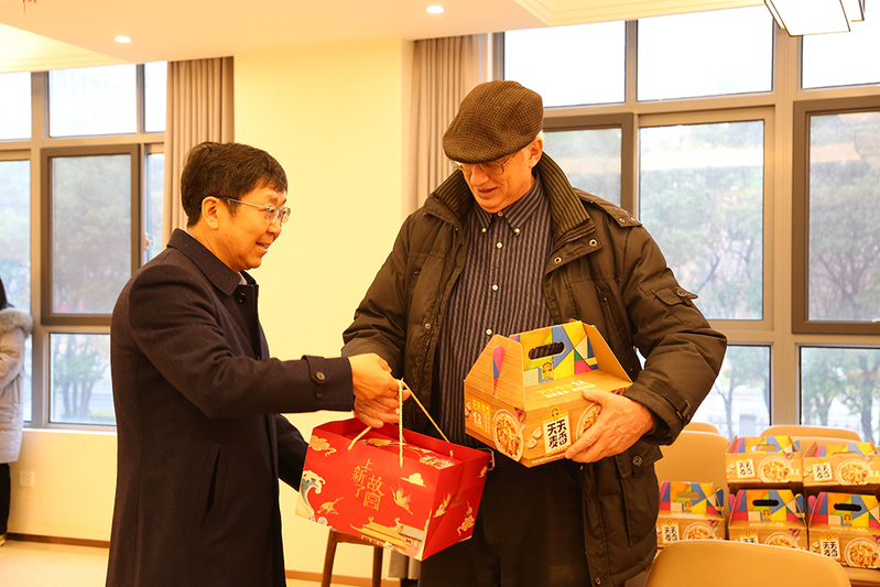 蒋乃华为寒假留校外教外专送上新年礼品。