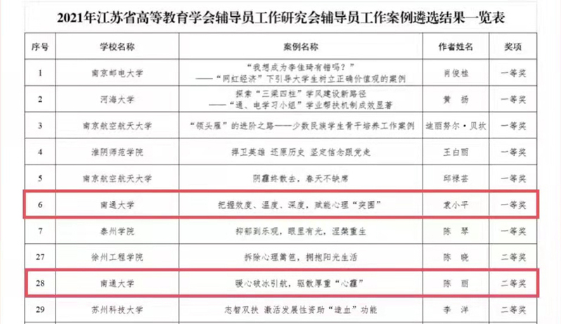近日,江苏省高等教育学会辅导员工作研究委员会公布了2021年辅导员工作案例遴选结果和专项课题立项结果。文学院党委副书记、副院长袁小平老师的案例《把握效度、温度、深度,赋能心理“突围”》荣获一等奖,经济与管理学院陈丽老师的案例《暖心破冰引航,驱散厚重“心霾”》荣获二等奖。另外,我校两项课题获批立项,其中医学院王燕妮老师的《新时代以活动为引领的高校劳动教育研究》获批一般项目,药学院卫永霞老师的《“三全育人”视域下高校寝室育人功效提升路径研究》获批指导项目。