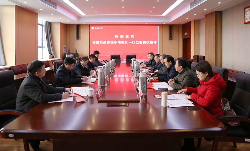 1月19日上午,省委统战部副部长徐东海,研究室(宣传办)主任张岩、副主任封荣生一行来校调研考察,南通市委统战部常务副部长马建清陪同调研。校党委副书记、副校长高建林出席座谈会,校党委常委、组织部部长、统战部部长王卫东主持会议。