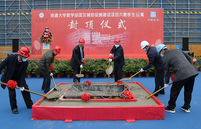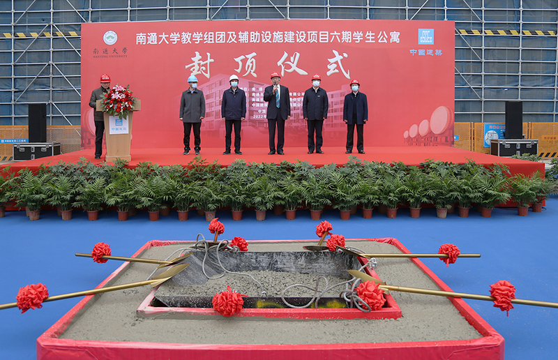 施卫东代表学校对六期学生公寓主体结构封顶表示祝贺。他指出,六期学生公寓主体结构顺利封顶,标志着南通大学教学组团及辅助设施建设项目取得了阶段性成果,为后续项目的实施和推进奠定了坚实基础。他代表学校向各参建单位以及日夜奋斗在项目建设工地的全体建设者表示感谢和慰问。他表示,希望所有参建单位要以六期学生公寓主体结构封顶为契机,紧紧围绕“建精品工程、办百年名校”的目标,发扬“特别能吃苦、特别能战斗”的精神,继续保持顽强的战斗作风、锻造钢铁的战斗意志,加强统筹和协调,为优质高效地完成我校教学组团及辅助设施建设项目、为全面提升我校综合实力和核心竞争力、为早日建成特色鲜明的高水平大学贡献力量。