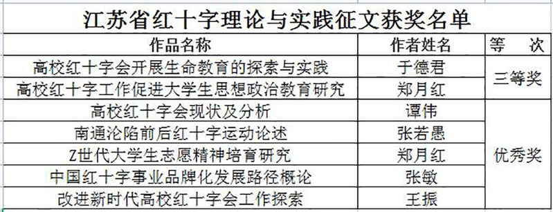 近日,江苏省红十字会公布“江苏省红十字理论与实践征文活动”获奖名单。我校报送的征文荣获三等奖2项,优秀奖5项。