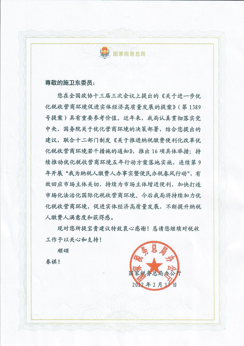 在公函中,国家税务总局认为该提案具有重要参考价值。在认真贯彻落实党中央、国务院关于优化营商环境的决策部署过程中,国家税务总局结合该提案相关建议,联合十二部门制发《关于推进纳税缴费便利化改革优化税收营商环境若干措施的通知》,推出16项具体举措,并持续推动优化税收营商环境五年行动方案落地实施,连续第9年开展“我为纳税人缴费人办实事暨便民办税春风行动”,有效回应市场主体关切,持续为市场主体增进便利,加快打造市场化法治化国际化税收营商环境。