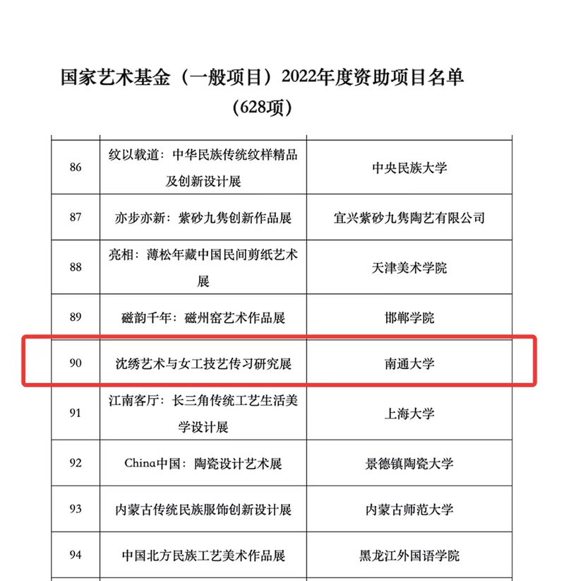 近日,2022国家艺术基金(一般项目)年度资助名单公布,我校《沈绣艺术与女工技艺传习研究》获得本年度传播交流推广资助立项。