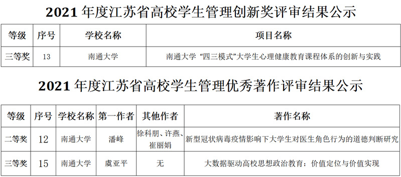 近日,2021年度江苏省高校学生管理创新奖及优秀著作评选活动结果揭晓,我校学生工作处申报的《南通大学“四三模式”大学生心理健康教育课程体系的创新与实践》获高校学生管理创新奖三等奖,我校纺织服装学院辅导员潘峰的论文《新型冠状病毒疫情影响下大学生对医生角色行为的道德判断研究》,公共卫生学院辅导员虞亚平的论文《大数据驱动高校思想政治教育:价值定位与价值实现》分别获高校学生管理优秀著作二、三等奖。