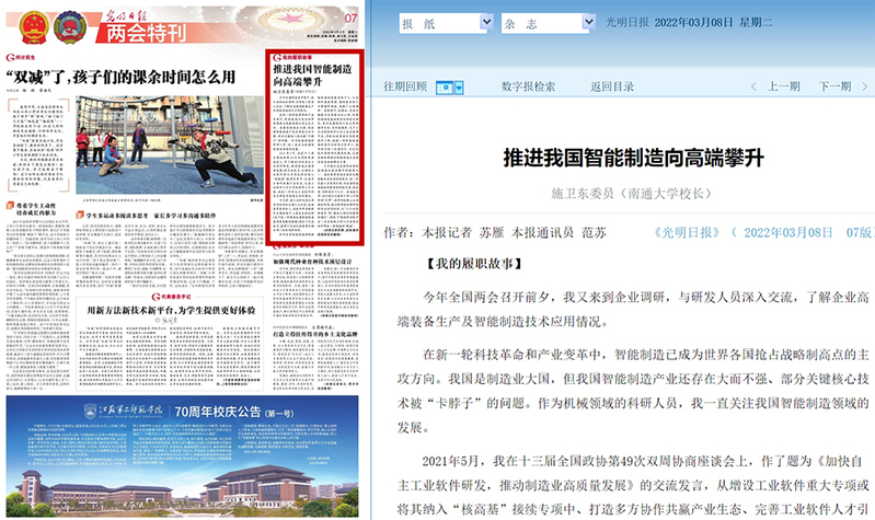 今年两会期间,施卫东委员共提交27份提案和5条社情民意信息,其中《关于抑郁症筛查纳入学生体检应保护未成年人合法权益的提案》受到新华网、《中国教育报》、中国教育新闻网等媒体关注13次;《关于进一步推进我国智能制造高质量发展的提案》受到《光明日报》、《新华日报》等媒体关注9次;《关于多措并举持续推动“双减”政策落地落实的提案》受到《新华日报》、荔枝新闻等媒体关注8次;《关于推广综合能源服务、助力“双碳”目标实现的建议》受到《国家电网报》《中国船舶报》等媒体关注7次。刘璠代表共提交8份建议,其中,《关于加强村卫生室人才队伍建设的建议》受到新华网、央广网等媒体关注3次。报道充分彰显了我校代表委员建言献策、参政议政的履职能力,扩大了我校的社会影响。