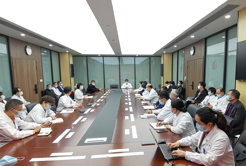 高建林指出,当前疫情形势已从常态化防控转入应急性战时状态,全院工作要以两个“严”为原则:严防死守,采取一切措施严防疫情侵入医院;严阵以待,做好一切准备应对可能出现的极端状况。就做好疫情防控和医疗救治工作,高建林要求重点做好三方面工作。一要守住底线。这个底线是:在严防疫情侵入医院的同时,保证急危重症患者救治以及孕产妇、血透、恶性肿瘤等患者医疗服务。在全院执行“三组轮值24小时*n天”制度,确保任何情况下院内都有一支包括指挥系统、管理系统、运行系统在内的功能相对全面的成建制队伍,同时尽可能减少院内人员聚集,全院人员做到非必要不进病区、非必要不进楼栋、非必要不流动。二要全面保障。其中最重要的是保量又保质的物资保障,包括防疫用品、生活用品、药品耗材以及大型仪器设备维护用品的储备等。对物资储备要做到“眼见为实”,不能仅满足于“预订”,防止因疫情导致的供应短缺和物流受阻。相关物品做到严格验收、严格保管、严格领用,强化责任制,杜绝可能出现的次生问题。三要忙而不乱。任务越重、事务越杂、压力越大,越要保持头脑冷静,做到有条不紊、井然有序、不乱分寸。不仅如此,还要对照时间节点,协调推进医院年度重大事项和重点工作,不能顾此失彼;深入一线挖掘宣传素材、推出典型,弘扬正能量、提振精气神、激发原动力。高建林强调,非常时期,非常举措。全院上下要全面动员、党员示范、厉兵秣马、严守底线,全力以赴打赢这场疫情攻坚战。