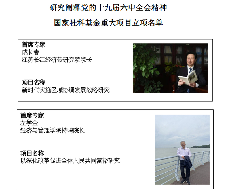 近日,“研究阐释党的十九届六中全会精神”国家社科基金重大项目立项名单公布,我校江苏长江经济带研究院院长成长春团队、经济与管理学院特聘院长左学金团队的项目喜获立项。这是继周建忠团队、刘芝凤团队之后,我校人文社科高层次项目取得的重大突破,是建设特色鲜明高水平大学取得的又一标志性成果。