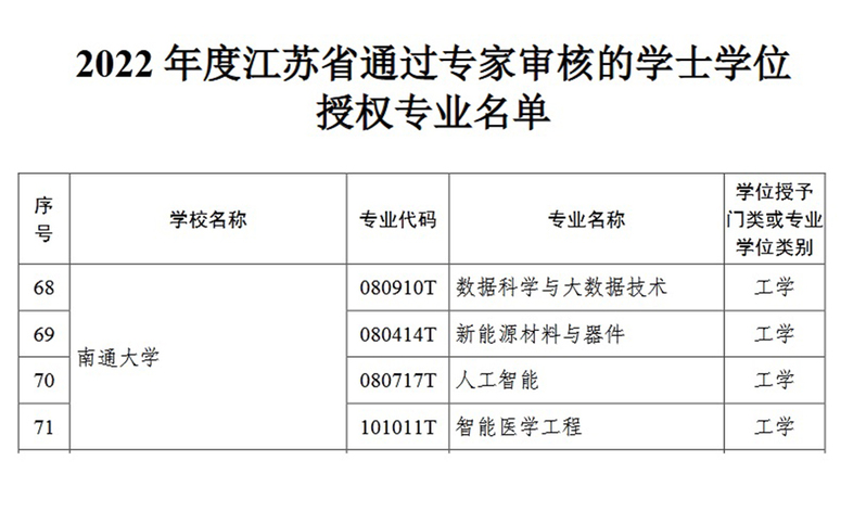 根据江苏省教育厅《2022年度江苏省学士学位授权专业审核结果公示》,近日,全省61所高校235个专业获学士学位授权。其中,我校数据科学与大数据技术、新能源材料与器件、人工智能、智能医学工程4个专业获得授权。