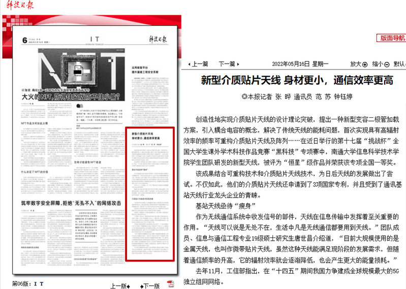 5月16日出版的《科技日报》以《新型介质贴片天线 身材更小,通信效率更高》为题,报道我校信息科学技术学院学生团队的科研创新成果。