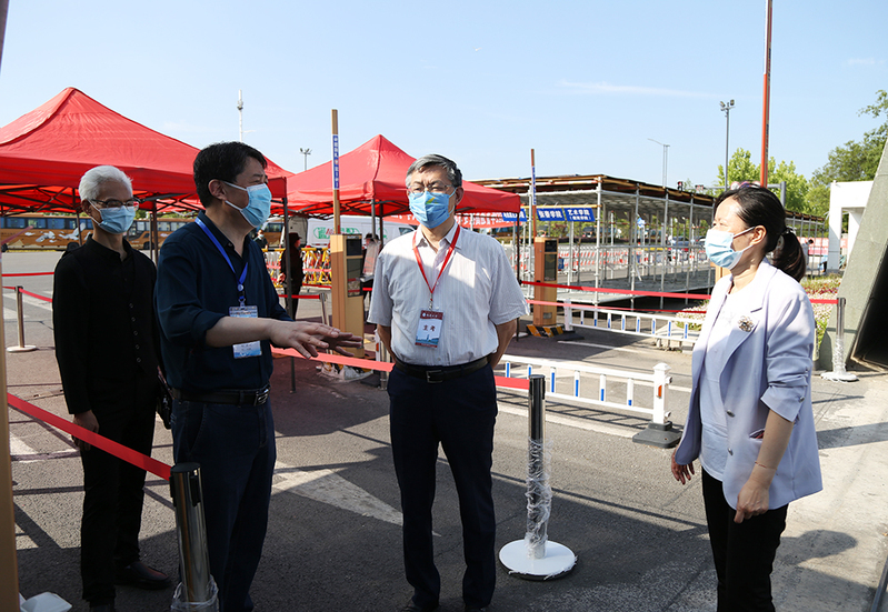 浦玉忠、顾菊平在南门进行巡查指导。