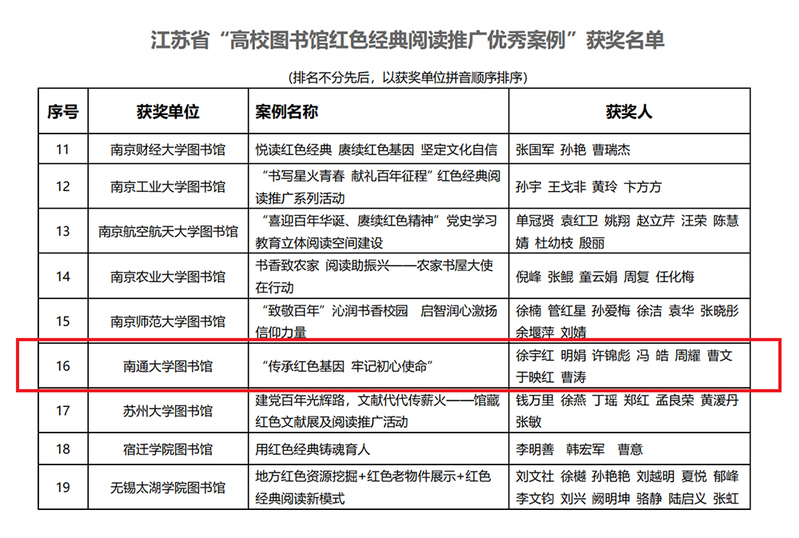 在喜迎学校建校110周年之际,江苏省“高校图书馆阅读推广优秀案例”评选获奖名单公布,由我校图书馆党总支书记徐宇红主持申报的《传承红色基因 牢记初心使命》案例荣获优秀案例。