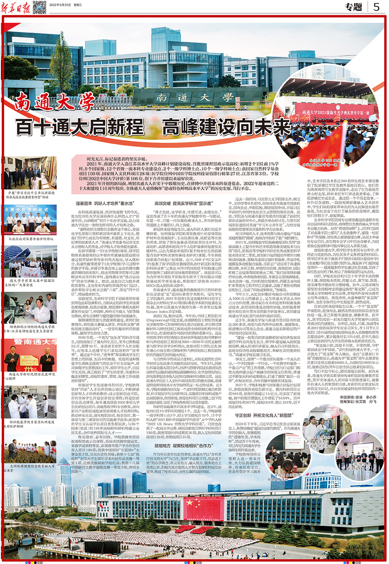 5月25日出版的《新华日报》以《南通大学:百十通大启新程 高峰建设向未来》为题,整版报道我校办学成效。