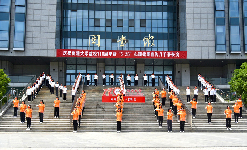 在活动主场地啬园校区图书馆南广场前,110名同学组成手语表演队,在学校心理健康教育服务中心、艺术学院、南通市特殊教育学校联合编排录制的《一起向未来》歌曲伴奏下,交替摆出“110”、“520NTU”、“5·25 ”等造型。他们以身体和心灵的协调之美献礼百十校庆,同时庆祝“5·25”大学生心理健康节,并借此号召全校学生以平和的心态敞开心门、积极行动,一起奔向美好的未来。各学院也组织学生在分场地表演。