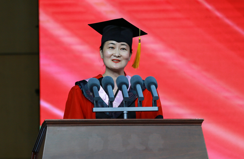 吴蓉教授代表研究生导师做了题为《愿理想、忍耐、热爱相伴一生》的发言。她勉励同学们要常怀理想,因为唯有沿着理想之光,才不会迷茫和彷徨;要学会忍耐,因为只有“动心忍性,曾益其所不能”,才能“待到山花烂漫时,她在丛中笑”;要保持热爱,因为只要足够热爱,奋斗之路就不会觉得孤寂,很多困难就会迎刃而解。