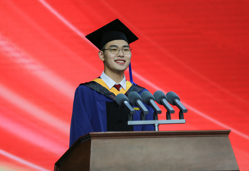 信息科学技术学院硕士研究生唐世昌代表毕业生发言。他深情回顾了在母校的经历和拼搏的时光,深深地表达了对新时代、对通大、对师长、对同学的爱。他表示,作为一名研究生应肩负起时代的责任与使命,以实现中华民族伟大复兴为己任。