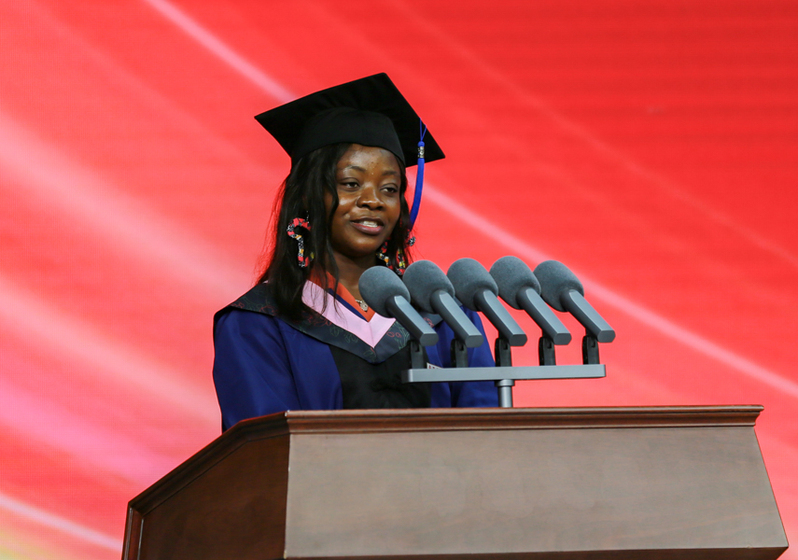 来自加纳的婷娜代表留学生发言。她说,中非是患难之交,中非友好关系不仅源远流长,而且历久弥坚。在通大的六年里,她一直梦想用在母校学到的知识,建设自己的国家,同时,她也表示会用自己的亲身经历,向加纳人民讲好中国故事。