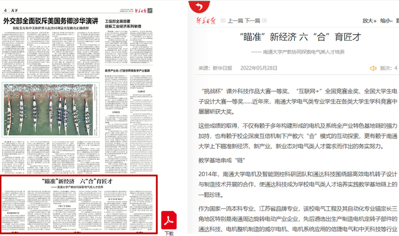 5月28日出版的《新华日报》以《“瞄准”新经济 六“合”育匠才—— 南通大学产教协同探索电气类人才培养》为题,关注我校产教协同探索电气类人才培养。