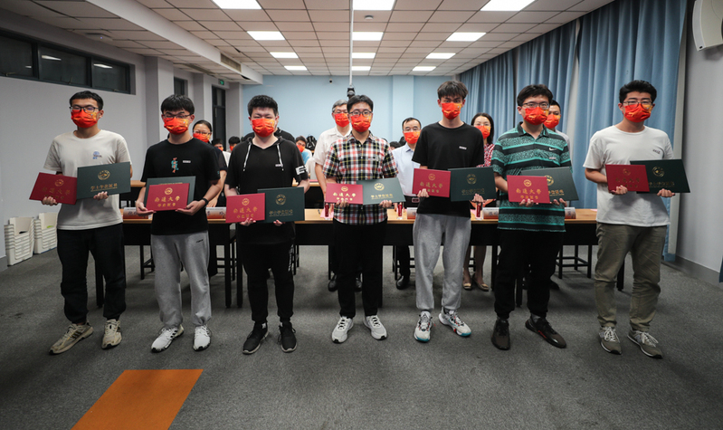 教务处处长华亮宣读张謇学院2022届本科优秀毕业设计、本科毕业生、获得学士学位学生名单;学生工作处副处长金翼宣读张謇学院2022届本科优秀毕业生、考取硕士研究生名单。与会领导为张謇学院首届毕业生颁发荣誉证书、毕业证书和学士学位证书。