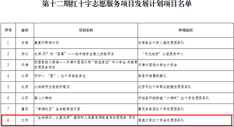 近日,2022年度中国红十字总会“第十二期红十字志愿服务项目发展计划项目”名单公布,我校“生命绿洲,以爱注源”遗体和人体器官捐献宣传志愿服务项目入选其中。全国共27个项目入选,其中江苏省仅有2项。