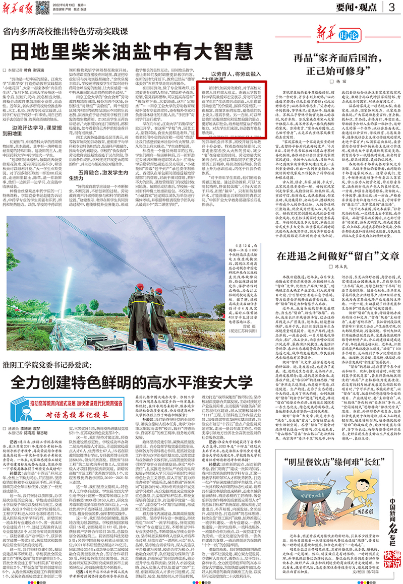 6月13日出版的《新华日报》以《田地里柴米油盐中有大智慧》为题,就高校推出特色劳动实践课的相关问题专访我校教育科学学院教授邓宏宝。