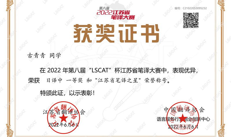 近日,2022年第八届“LSCAT”杯江苏省笔译大赛结果揭晓。外国语学院日语系学子再创佳绩,获“江苏省笔译之星”1项、一等奖6项、二等奖14项、三等奖15项、优胜奖16项。其中,日语201班古青青同学荣获日译汉组一等奖和“江苏省笔译之星”称号。