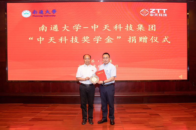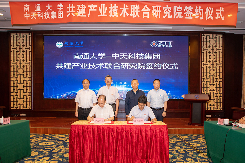 仪式上,我校服务地方工作处处长高江宁与中天科技集团总工程师谢书鸿共同签署了“南通大学——中天科技集团共建产业技术联合研究院协议”;社会资源处处长岳泳与中天科技集团人力资源部总经理钱蒋锋共同签署了“中天奖学金”捐赠协议。