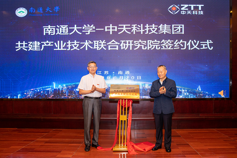 校党委书记浦玉忠与中天科技集团董事长薛济萍共同为“南通大学——中天科技产业技术联合研究院”揭牌。