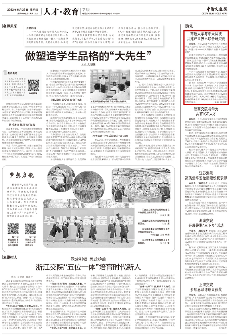 6月23日出版的《中国交通报》报道我校与中天科技集团共建“南通大学——中天科技产业技术联合研究院”。