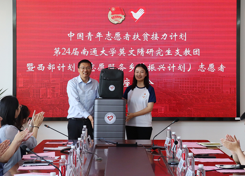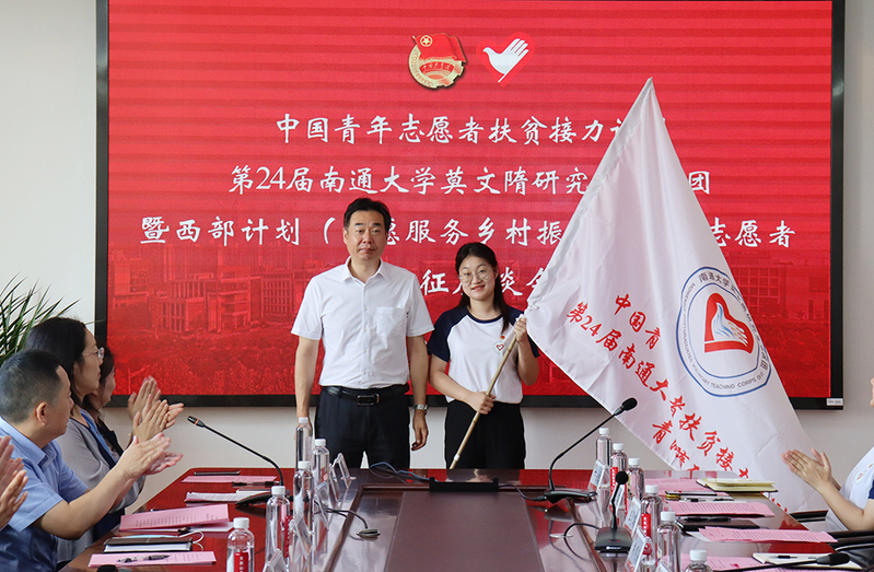 6月22日上午,“西部计划”第24届南通大学莫文隋研究生支教团出征座谈会在啬园校区举行。校党委常委、副校长侯文华出席会议并讲话。校党委常委、宣传部部长吉明明向第24届南通大学莫文隋研究生支教团青海分队、新疆分队授旗。