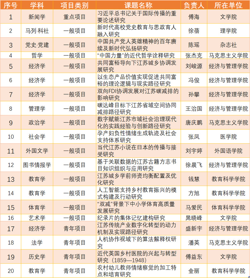 6月24日,江苏省哲学社会科学规划办公室公布2022年度江苏省社科基金立项项目,我校喜获立项资助项目20项,其中重点项目1项,一般项目15项,青年项目4项。立项总数位列全省第四,仅次于南京师范大学、南京大学、苏州大学。
