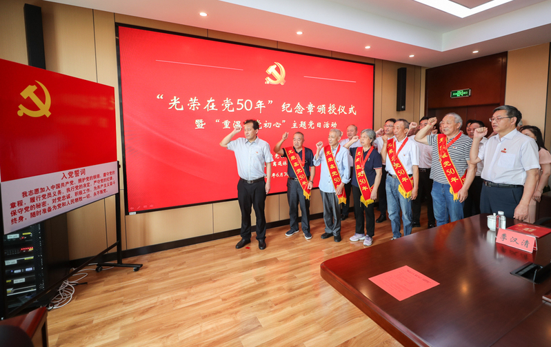仪式中,浦玉忠为2022年“光荣在党50年”纪念章获得者代表颁授纪念章;吉明明、党委办公室主任吴如高为“光荣在党50年”纪念章获得者颁发政治生日贺卡;王卫东带领与会全体党员重温入党誓词。