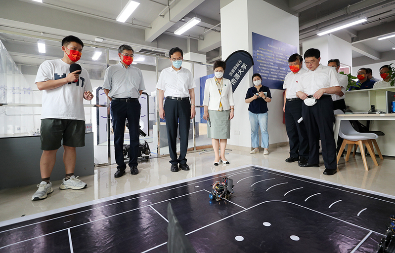 王晖一行来到我校大学生创新创业实践教育中心,仔细听取了我校毕业生就业创业工作开展、创业课程设置、学科创新竞赛等情况汇报,实地参观机器人创新工作室、艺术工坊等大学生创新创业项目,并与在现场开展暑期创新创业实践的同学们亲切交谈,了解他们的就业创业意愿。王晖充分肯定了我校教育发展及大学生就业创业工作开展所取得的成绩,强调要更好汇聚校内外资源,引入更多科创项目,为学生就业创业营造更好环境;要持续提升高等教育质量水平,不断提高毕业生留通就业率,为南通高质量发展提供更强人才支撑。