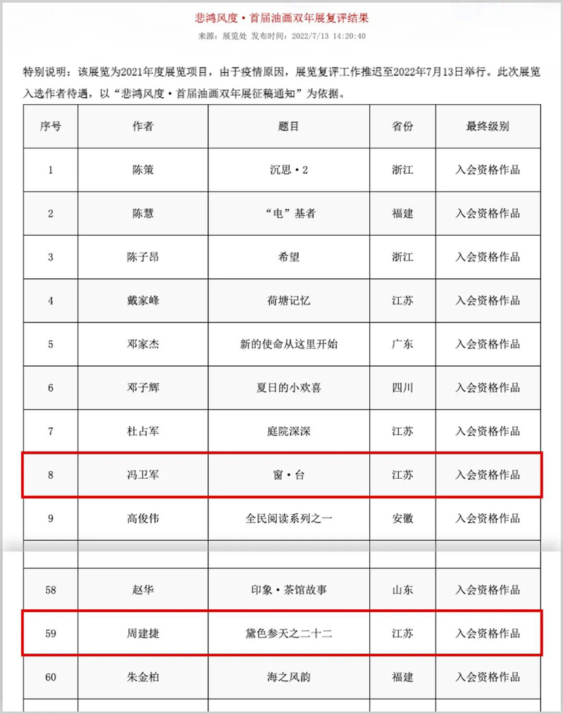 7月13日,“悲鸿风度·首届油画双年展”复评结果公布,艺术学院冯卫军老师的作品《窗·台》和周建捷老师的作品《黛色参天之二十二》获得入会资格奖,为本次展览最高奖项,这是本年度艺术学院教师获得的又一项国家级展览奖项。