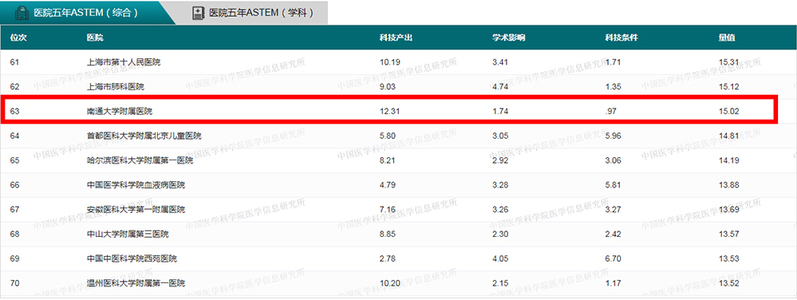 附属医院位列中国医院科技量值五年总榜单全国第63名。