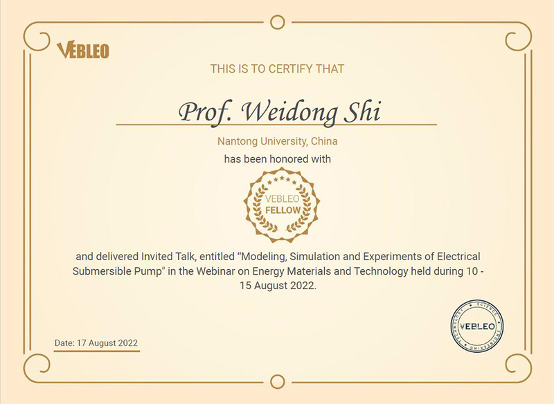 8月17日,校长施卫东被授予国际科学组织Vebleo协会会士(Vebleo Fellow),并于8月11日受邀在Vebleo主办的材料科学与工程技术国际会议(Materials Science, Engineering & Technology International Conference)上做了题为“潜水电泵建模、仿真与试验(Modeling, Simulation and Experiments of Electrical Submersible Pump)”的特邀报告。