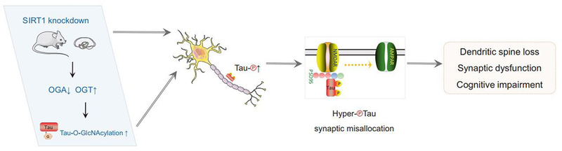 钱慰教授课题组长期关注SIRT1在tau蛋白病发生发展中的作用,发现SIRT1-flox/Cre+小鼠大脑中由于SIRT1水平降低触发tau蛋白O-GlcNAc糖基化增强,小鼠脑中位点特异性磷酸化tau在突触体表达及定位随之发生改变,从而导致神经元突触可塑性变异,发生学习和记忆障碍。研究结果为SIRT1作为临床tau蛋白病的潜在治疗靶点提供了证据。该项研究得到了国家自然科学基金的支持。
