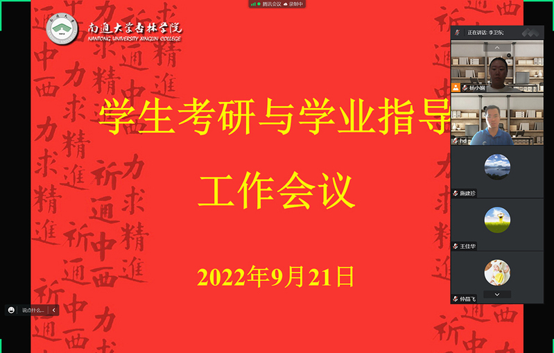 会上,杏林学院汉语言文学专业联系人李卫东、海洋技术专业联系人刘淮德、物联网工程专业联系人杨玲玲、医学部辅导员王媛媛先后做2022届毕业生考研工作经验交流。学院团委副书记杨晋娴、教务处教务运行科副科长孙红霞分别就各学部、各教研室的学业导师选聘、过去学年学生课外竞赛情况及做好学生学业救济与学业帮扶工作等,做情况交流与工作布置。