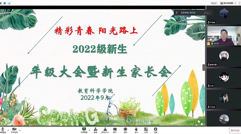 9月23日,教育科学学院召开“精彩青春,阳光路上”2022级新生年级大会暨新生家长会线上会议,部署新生入校报到相关工作。学院党委副书记兼副院长徐红波参加会议。