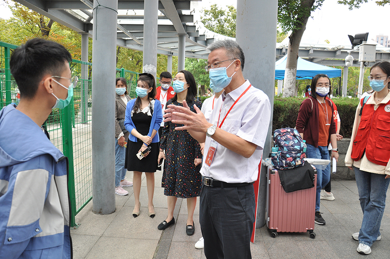 侯文华还代表学校对到站的2022级新生表示欢迎,并与部分抵通新生和新生家长交流,欢迎新生选择南通大学继续深造。