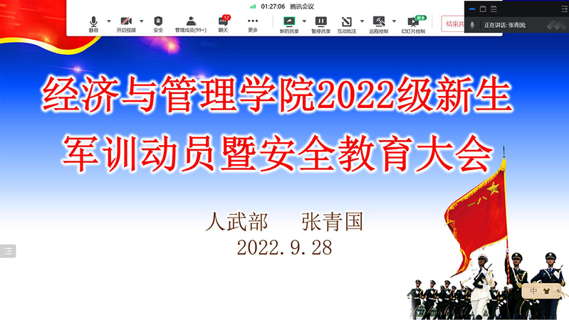 为进一步加强国防教育、提高安全防范意识,圆满完成2022级学生军训工作,9月28日,经济与管理学院线上组织开展2022级新生军训动员暨安全教育大会。人武部张青国老师受邀作为主讲嘉宾。