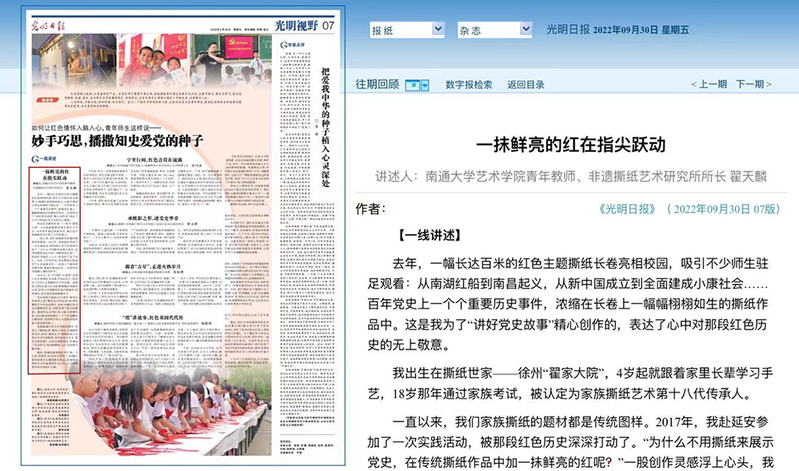 9月30日出版的《光明日报》以《一抹鲜亮的红在指尖跃动》为题,报道我校艺术学院青年教师、非遗撕纸艺术研究所所长翟天麟的故事。