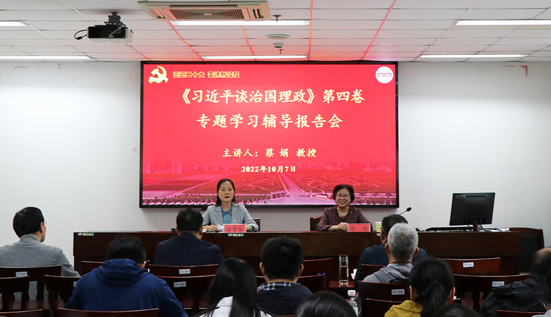 蔡娟教授从准确把握背景方位、整体把握框架内容、着力把握重点问题、牢牢把握学习方法四个方面对《习近平谈治国理政》第四卷做了详细解读,鼓励全体党员深入学习、及时学习、延伸学习、结合学习,深刻领悟蕴含其中的真理、哲理、道理、学理,准确把握“中国之治”的伟大创举、“中国之路”的成功密码、“中国之理”的思想内涵,学出坚定信念、学出责任使命、学出过硬作风。